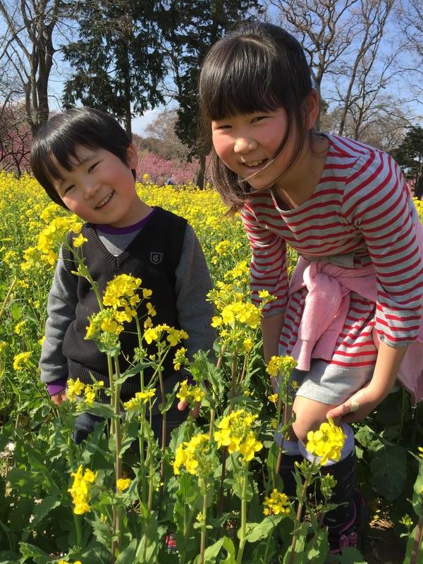 桃の木をバックに菜の花畑で撮りました。春全開の色合いがすごくキレイでした。