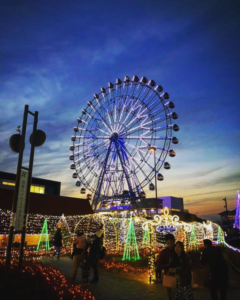 その日は、習い事の大会で少し足を伸ばしたドライブでした。大会も終わり、ハイウェイオアシスでひと休み。あたりは夕闇が迫り、ライトアップも始まる中での一コマでした。