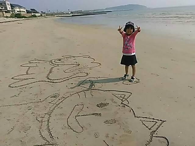 子供達と魚釣りを兼ねていつもより遠くへドライブ!娘がたいくつそうにしてるけど放っておいた。しばらくして様子を見に行くと浜辺に上手な絵が描けている!学校でも良く書いていたらしい。子供の成長は大人の物差しで見てはいけない事を知った日だった。