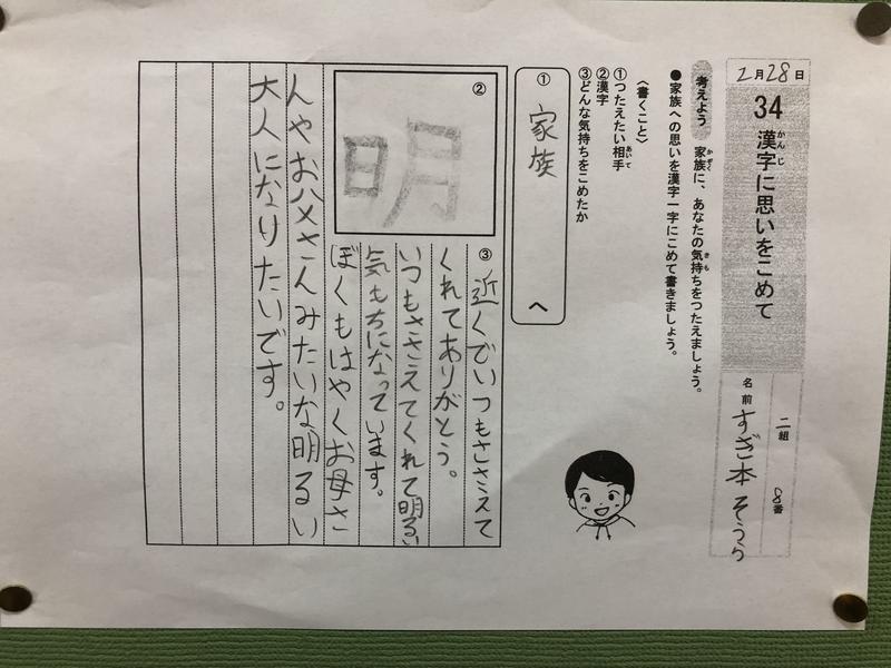 誕生日のすぐ後、上の息子の授業参観日があった!妻から時計、息子からは箸、娘からは猫の手のキーホルダーをもらい、しかも全てに手紙が添えてあり喜びは計り知れないものとなって私を包んだ!後だったのでそこまで感動する事もなく子供の成長を楽しんで参観していた。帰りがけに廊下に貼ってあった息子の書き物を見て改めて我が家を見つめ直す事が出来た!蒼空くん!君の成長が何よりの誕生日プレゼントだったよ!