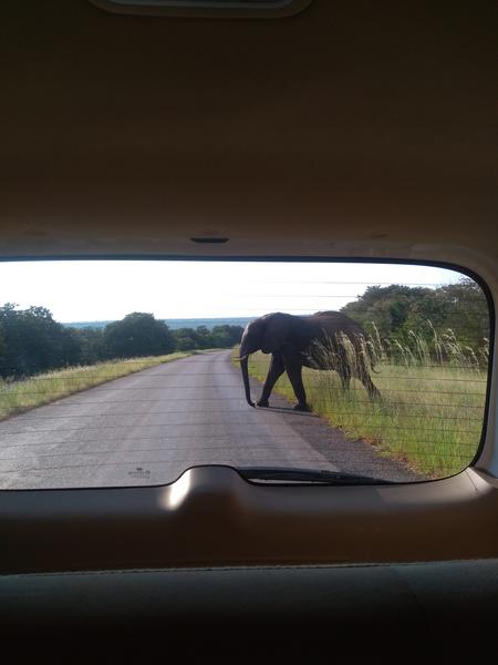 卒業旅行として、ジンバブエ、ボツワナ、南アフリカ共和国に一人旅してきました。ジンバブエからボツワナに陸路で移動中、道端にアフリカ象が現れたので車中より撮影しました。動物が好きで、野生動物に会うために行った旅行で会えた最初の動物でした。日本にはない、自然の雄大さを肌で感じることができた一枚です。