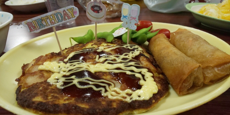 誕生日にも関わらず朝6時に出勤。午後3時半に勤務を終え急いで帰宅し犬の散歩、シャワーをあび身支度をし登山の為家を出る。家族の晩御飯は前日カレーを作り冷蔵庫に。家族と顔を会わせる事もなくもちろんお祝いの言葉もなし。でも私は山に行ける事でウキウキ。すでに会場ではテント張りの訓練を終え懇親会の真っ最中。遅れて入った私の目の前に手作りお好み焼き。そこにバースデーの旗が。そして30人近い会員さんからバースデーソング。この歳になっても祝ってもらえるのは嬉しいもの。記憶に残る誕生日となりました。