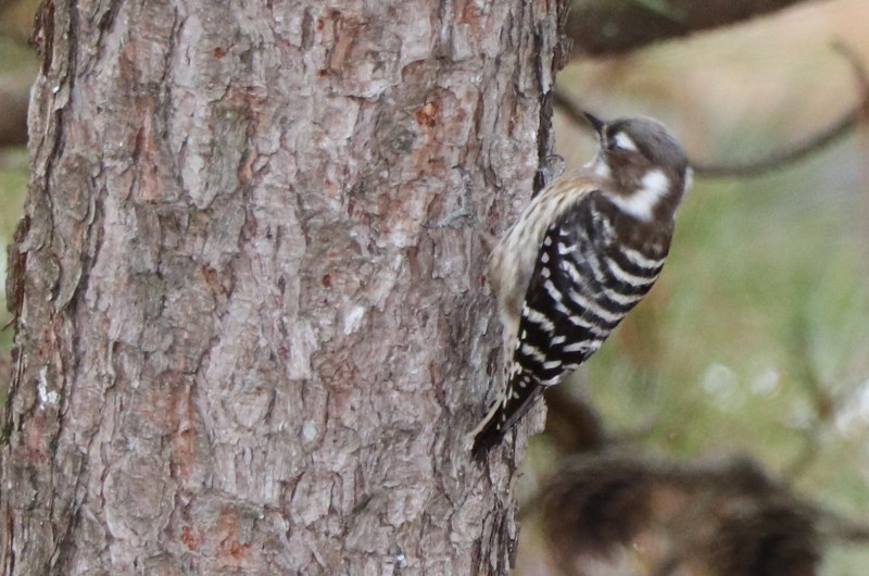 コゲラが、松の木にとまり必至にくちばしを木につついつていました。