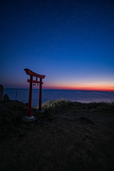 雲ひとつない晴天の空には、黒と青と赤のグラデーション美しい瞬間が夜中に訪れます。黒い夜空に光る星とブルーアワーの空、朝日の赤い光がなす、美しい瞬間と鳥居のコラボレーションは心に残る瞬間です。
