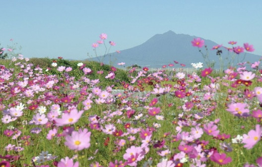快晴に恵まれた休日。今が満開のコスモスを見つけました。遠景には地元の名山。風もほとんどなく、素晴らしい景色を目の前に時間を忘れシャッターを押しました。