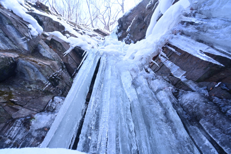 勢いよく流れる滝を下から眺めることは出来ませんが、冬の時期は違います。普段見ることの出来ない滝の姿を下から撮影しました。