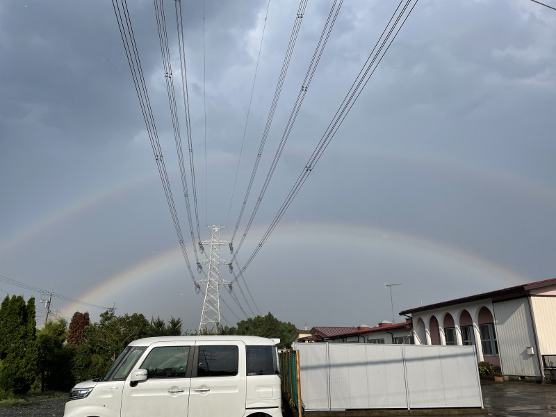 車でドライブに出かけた帰り、激しい夕立にあいました。すぐに止み、そのままドライブを続けていると、後部座席の子供が急に「携帯貸して!」と言うので、何かと思えばなんと虹が!しかもダブル!これはいいことがありそう!