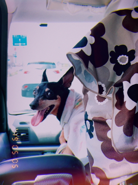 車酔いしないかなあと心配していた愛犬のミニチュアピンシャーは、車に乗ってむしろ元気!前のり!助手席占領!