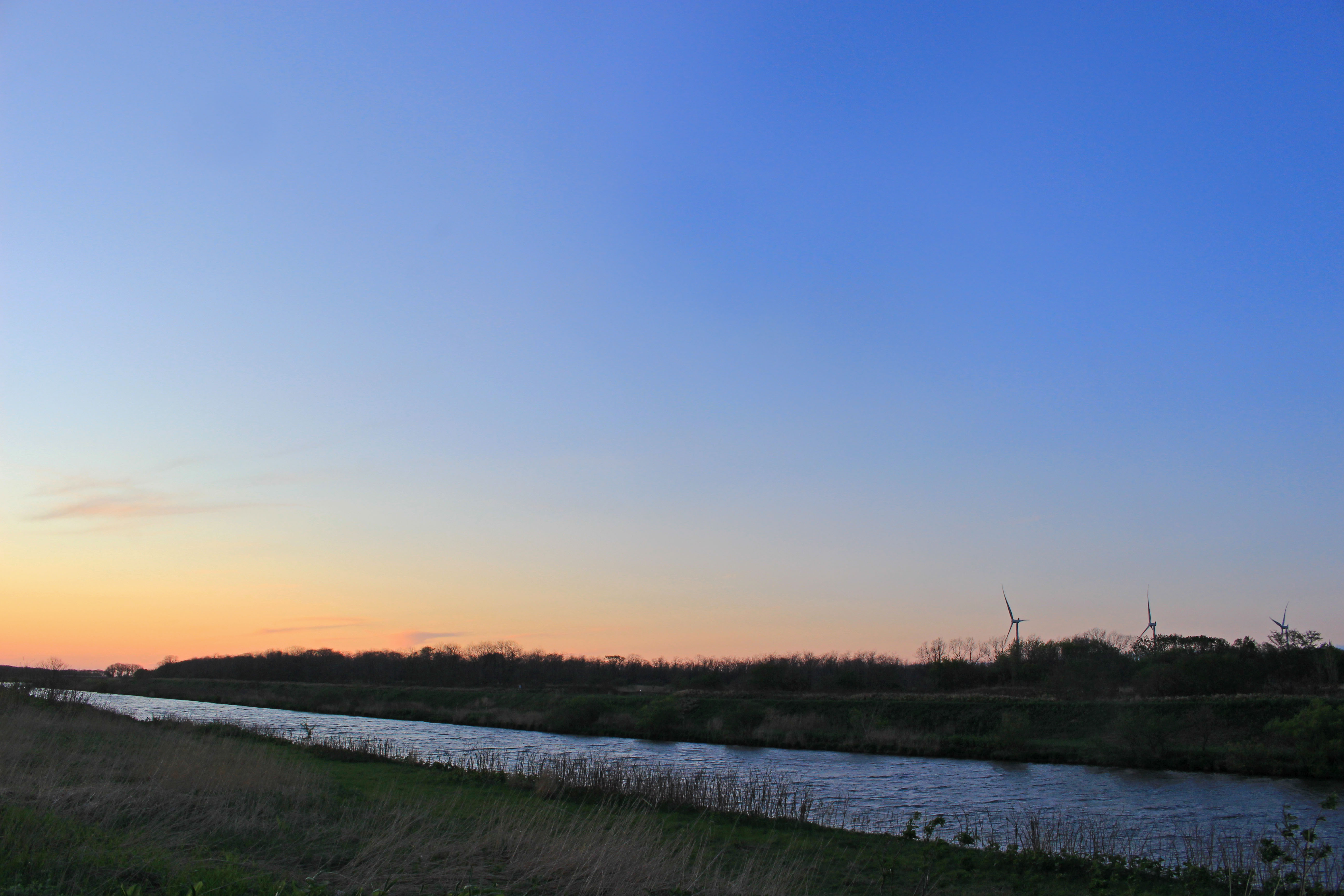 札幌の人工河川新川の河口付近、風力発電風車も