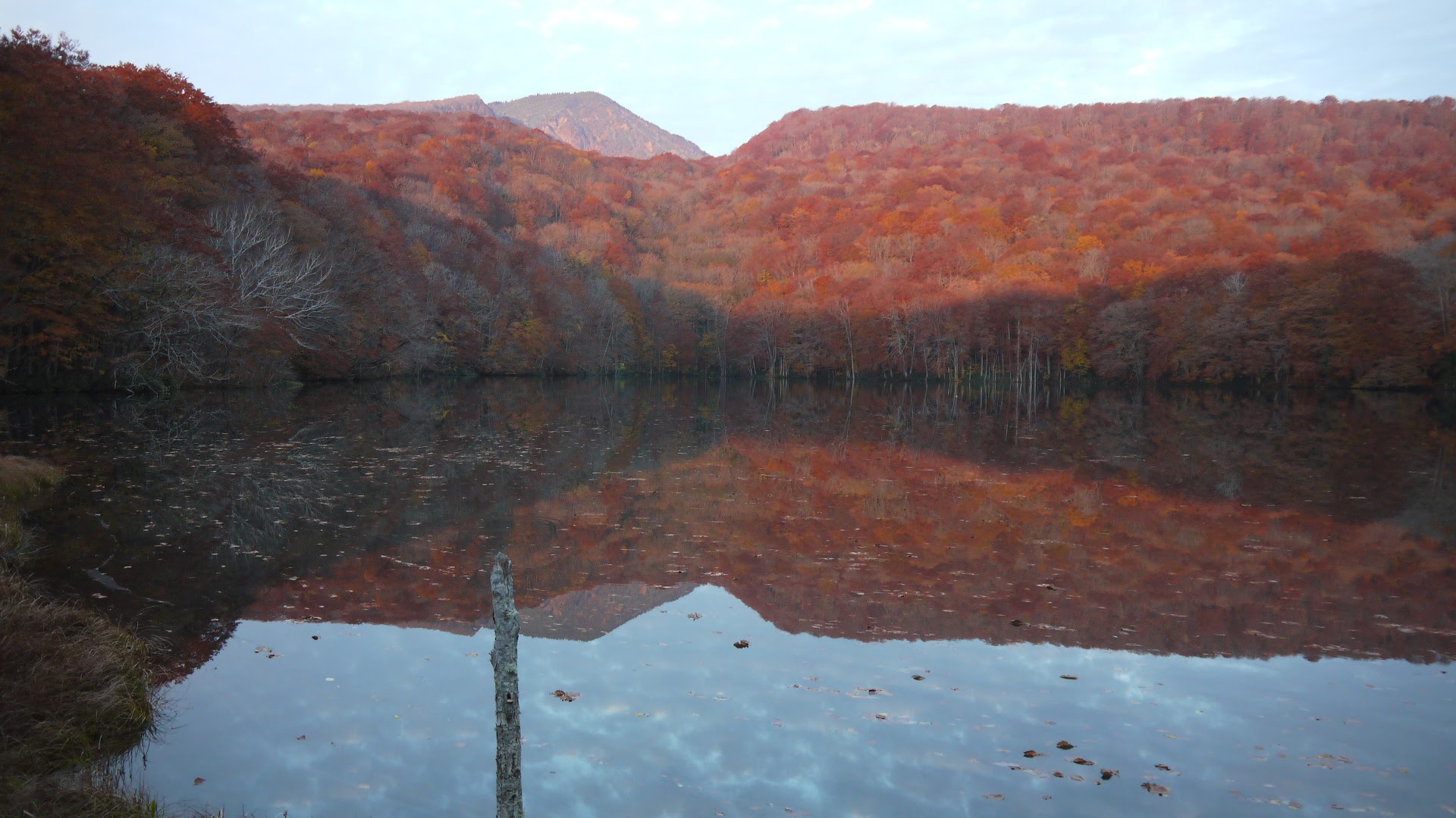 池に映る蒼い空と紅葉した山が絶妙です