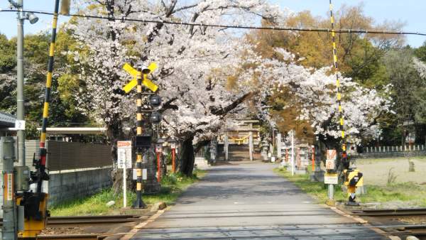 踏切越しの参道