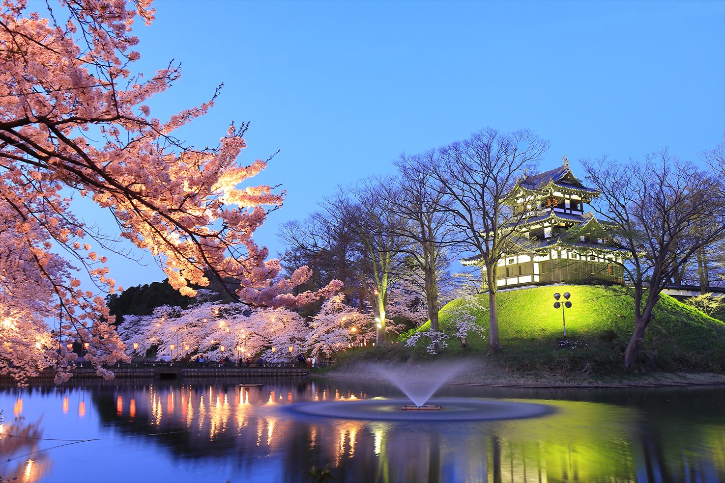 夜は、3,000個のボンボリに照らされて三重櫓を背景に満開の花びらが白く浮かび上がる姿が美しい。またお堀の水面に映った光が静かに揺れる幻想的な風景は、日本三大夜桜の一つとしても知られている。
