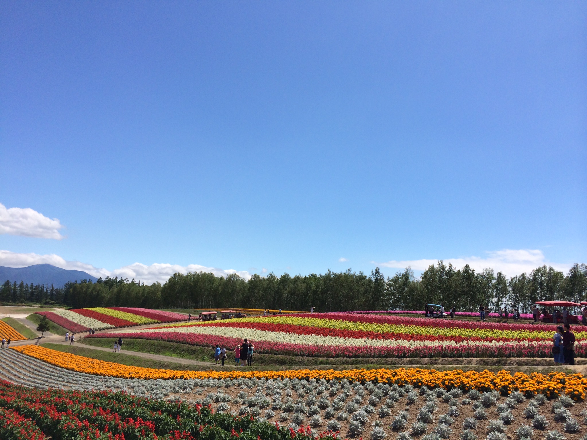背の高い花の間に隠れることもできるほどです。明るい色の花や、落ち着いた花など、たくさんのお花も楽しめます。ヘリコプターや、トラクターも乗ることができ、また徒歩でも充分、楽しむことができ、北海道牛のアイスクリームやじゃがいも等も堪狽キることができます。