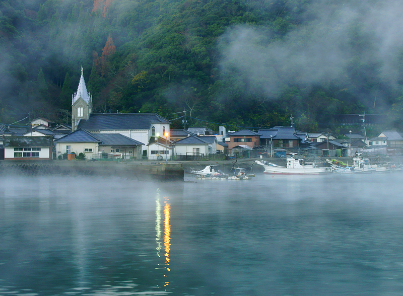 教会をバックに霧の中から漁船が出てくると寒さも吹っとびます。