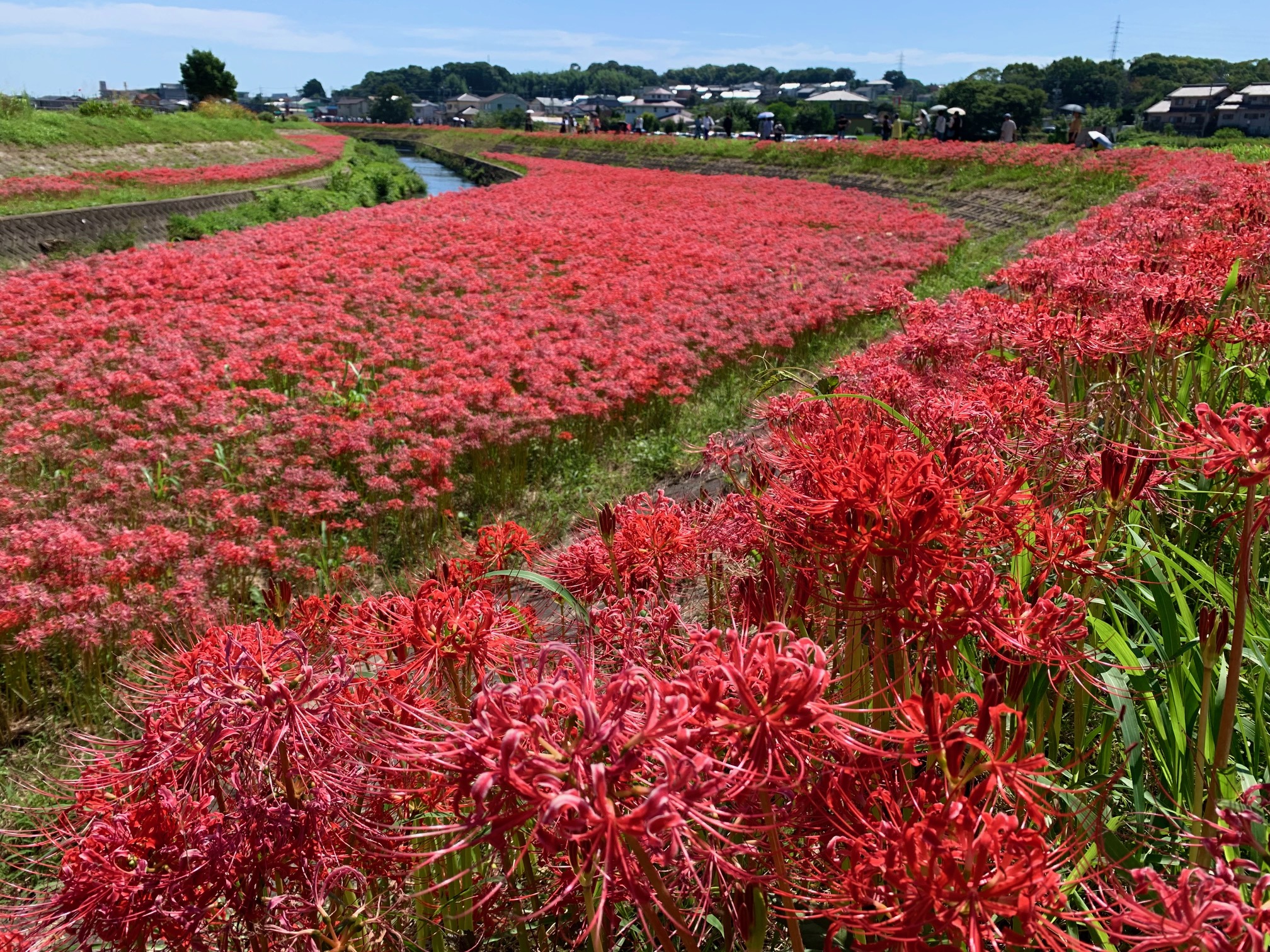 約300万本が 輝きを放ち、堤防斜面も赤く染まっています。