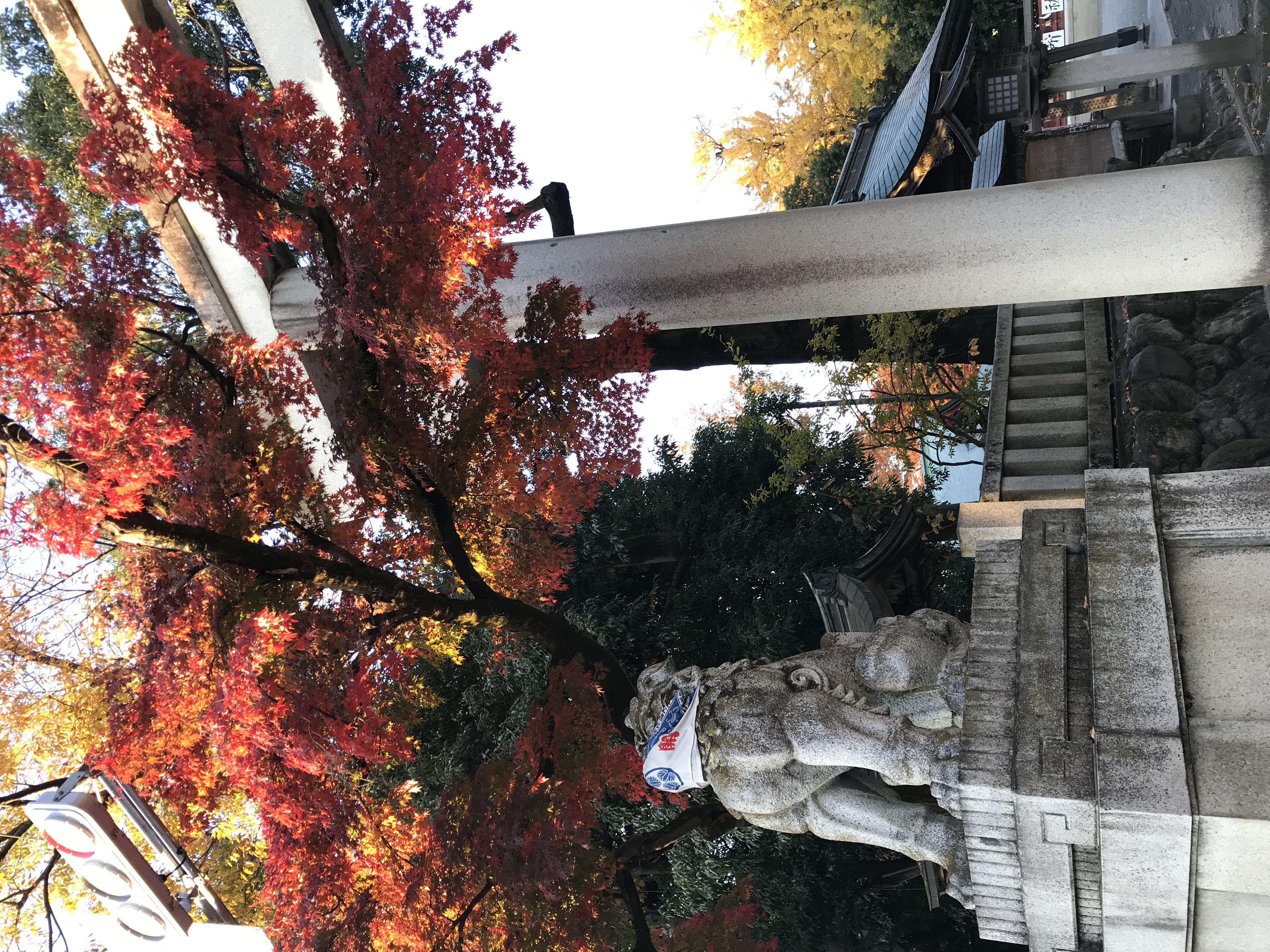 鳥居の横の狛犬たちはマスクをしていました。