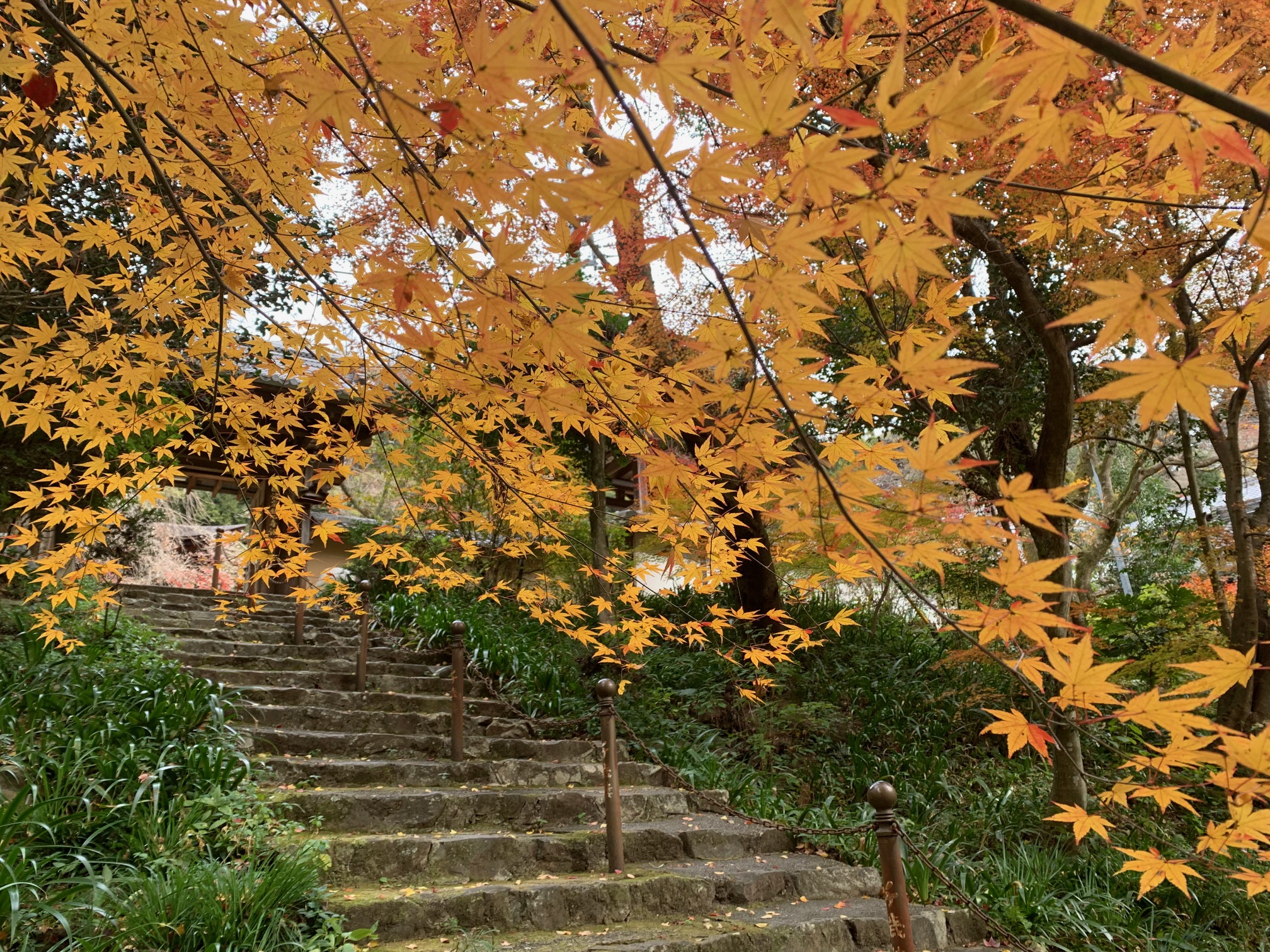 165段の石段の先に広がる イロハモミジの黄葉が 素晴らしいです。