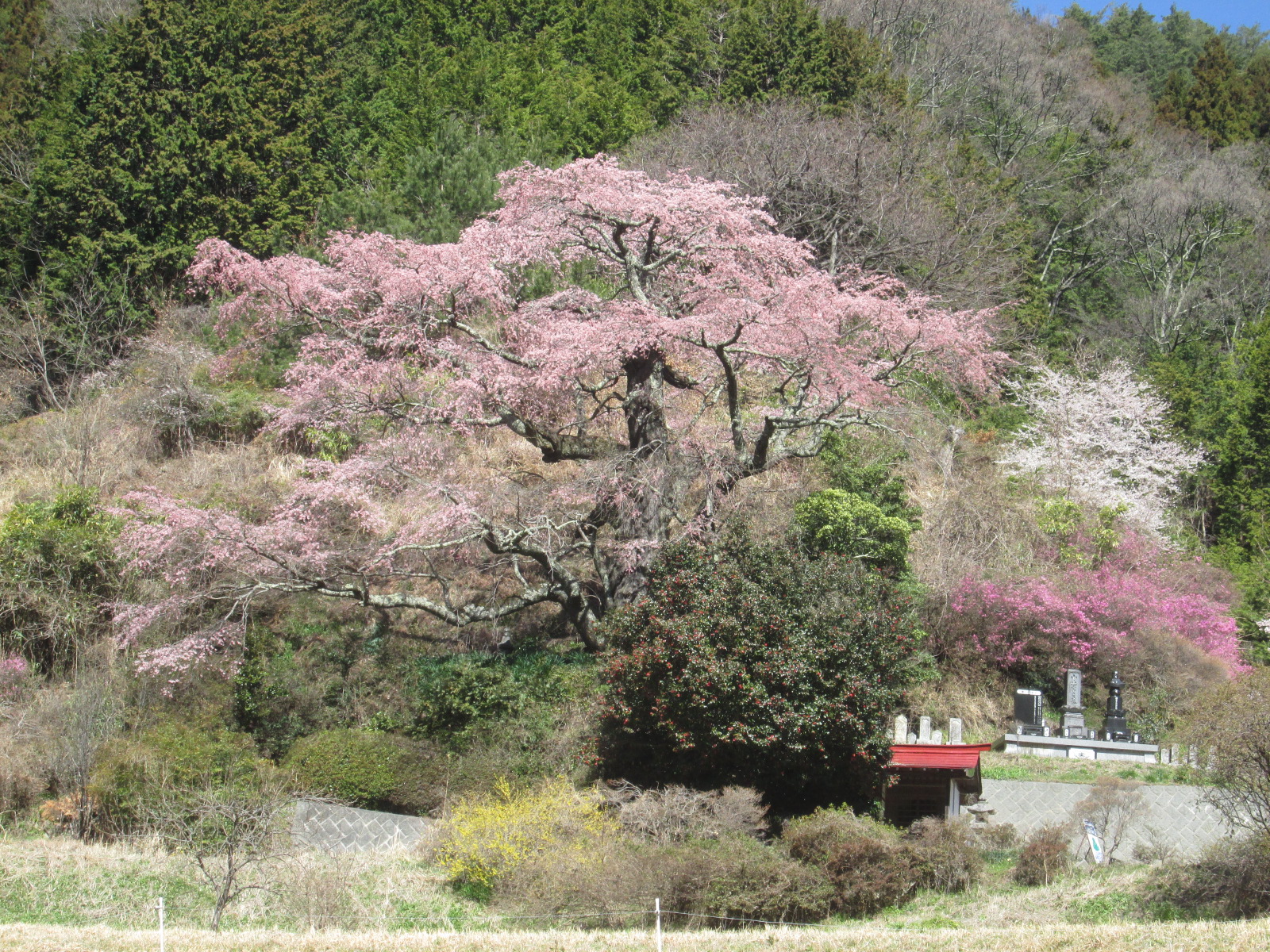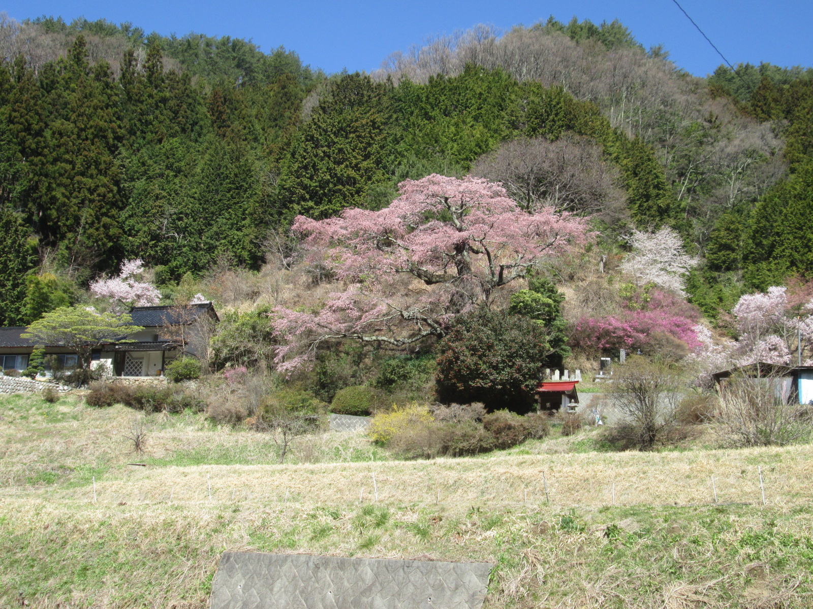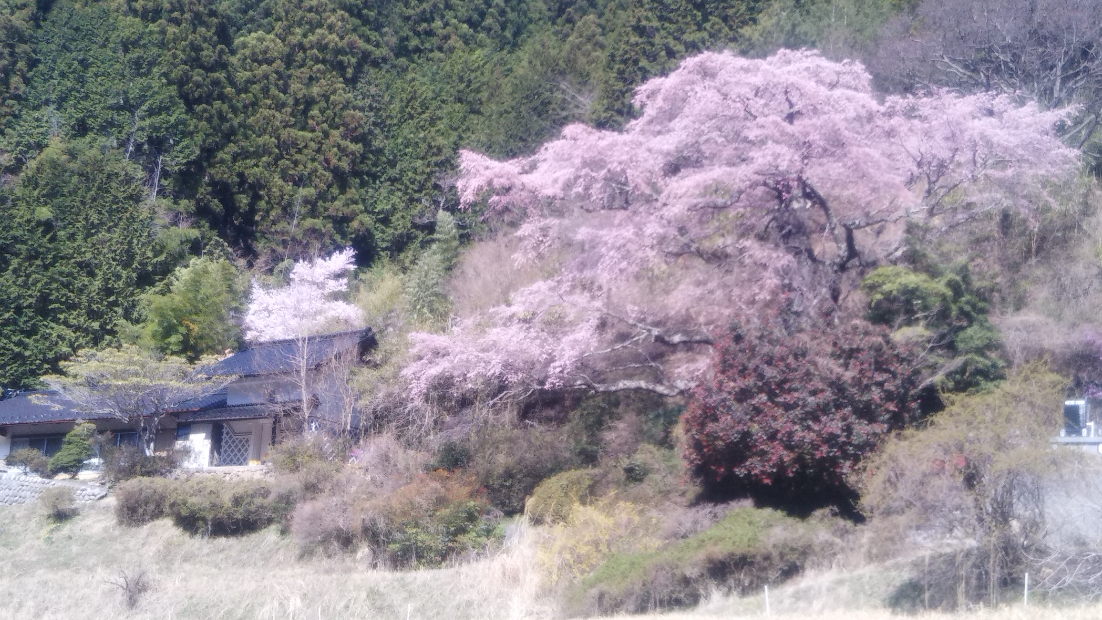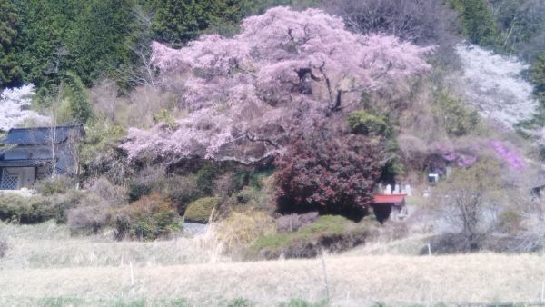 大きなしだれ桜が、山里にひっそりと咲いていました。長閑な雰囲気に咲いてていたので、癒され感100%ですね。まるで、日本の春を見ているようでした。