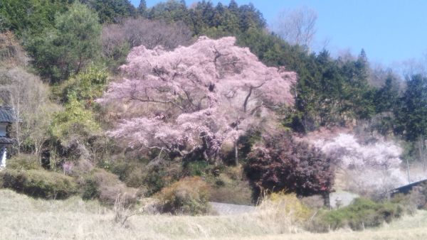 静かな山間にある大きなしだれ桜です。ほのかなピンク色が、山里の春を感じさせてくれました。周囲は山に囲まれていて、人通りも少ないので、ゆっくり鑑賞できます。(PS:数台分くらいの駐車場あり)