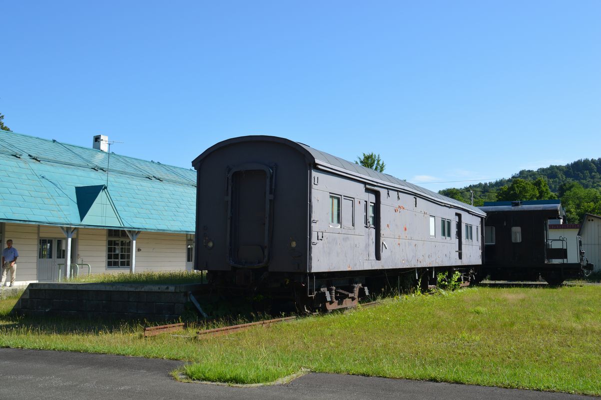 また、屋外の駅舎裏には荷物車(スユニ50)と車掌車(ヨ8000)が置かれています。
