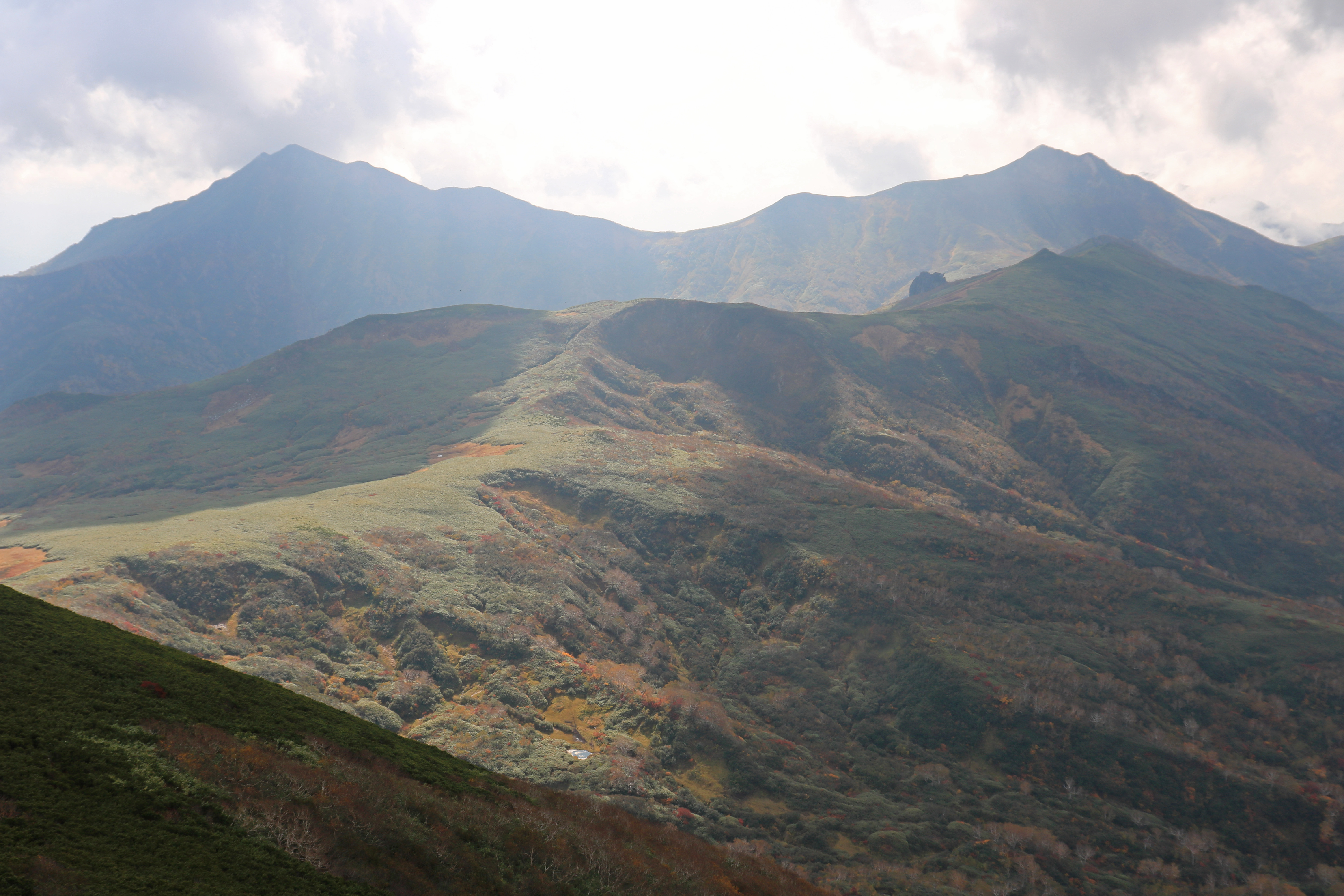 本州の山岳では標高2,500m以上でなければ高山植物を見ることができませんが、北海道の山岳では1,000mほどで確認することができ、暑寒別岳では標高1,400mの山頂台地付近に花畑が広がります。