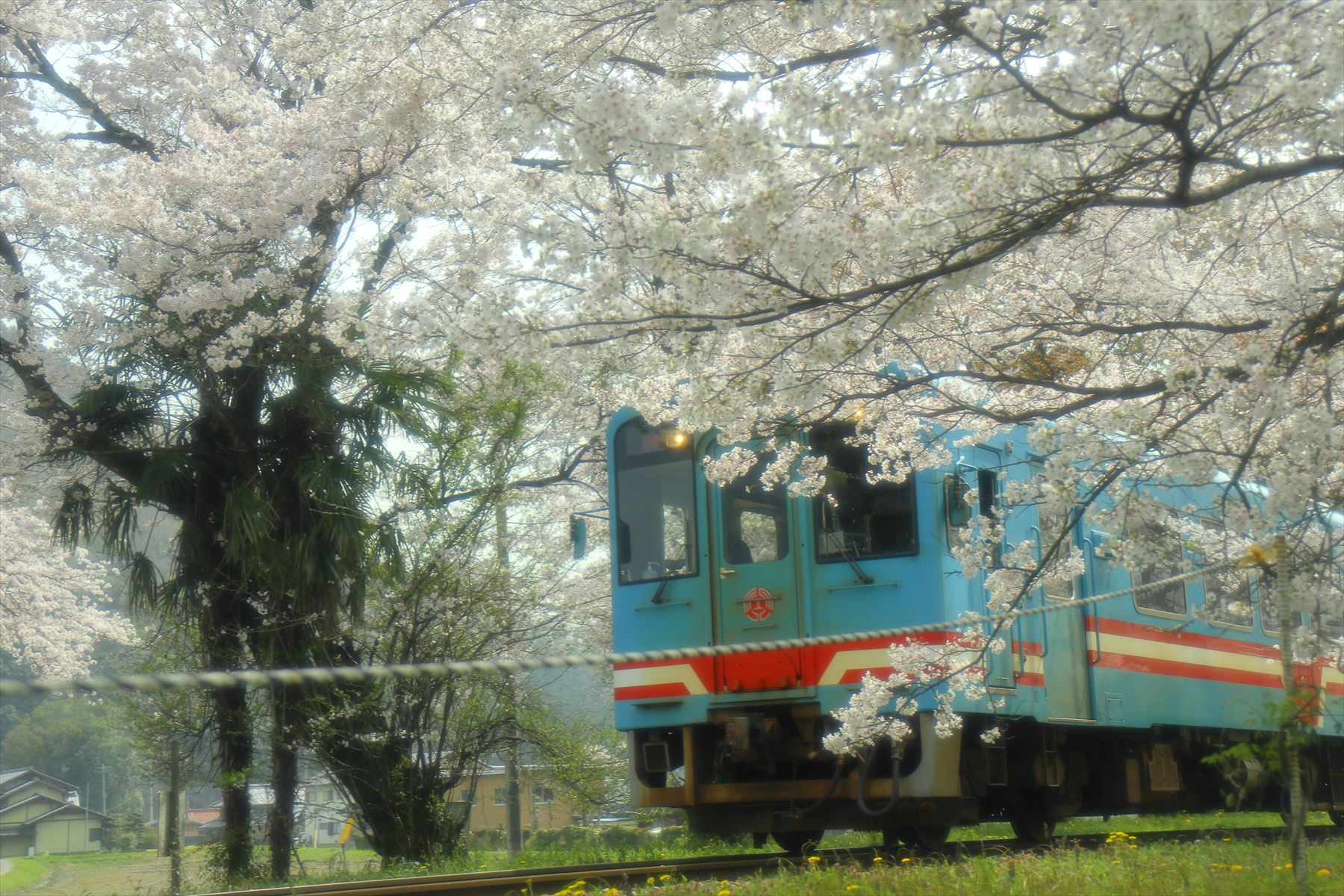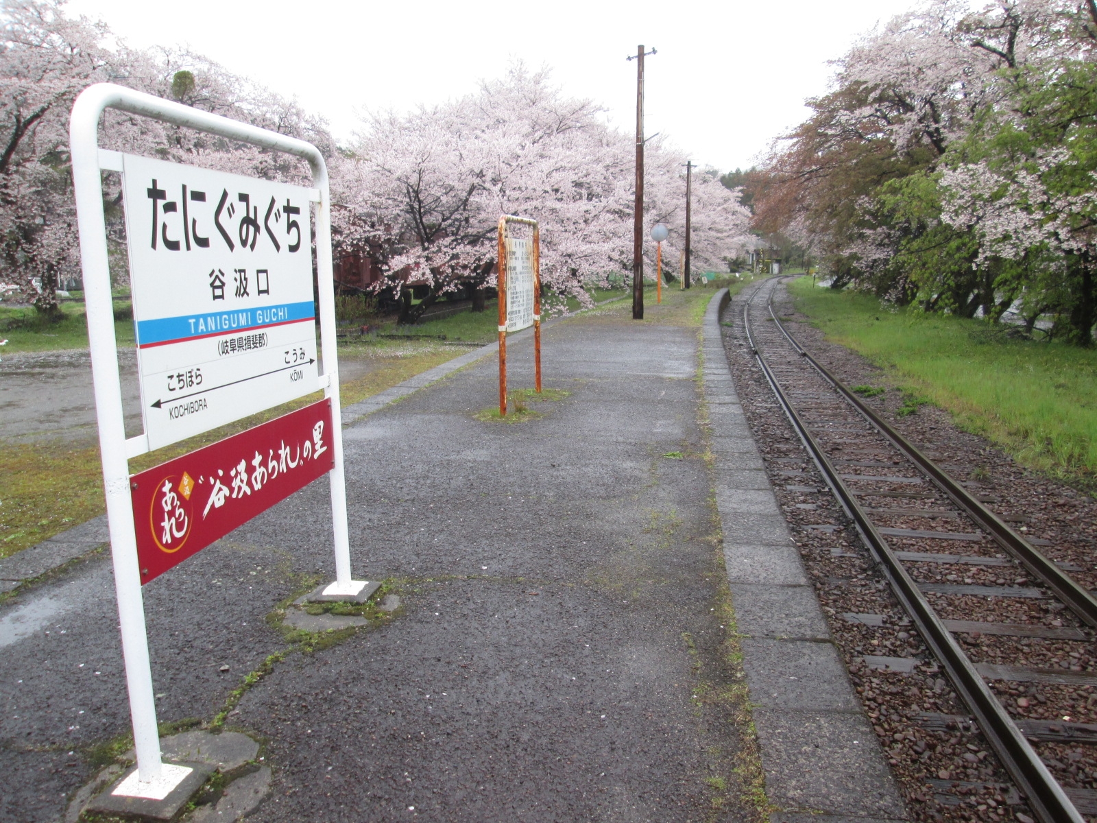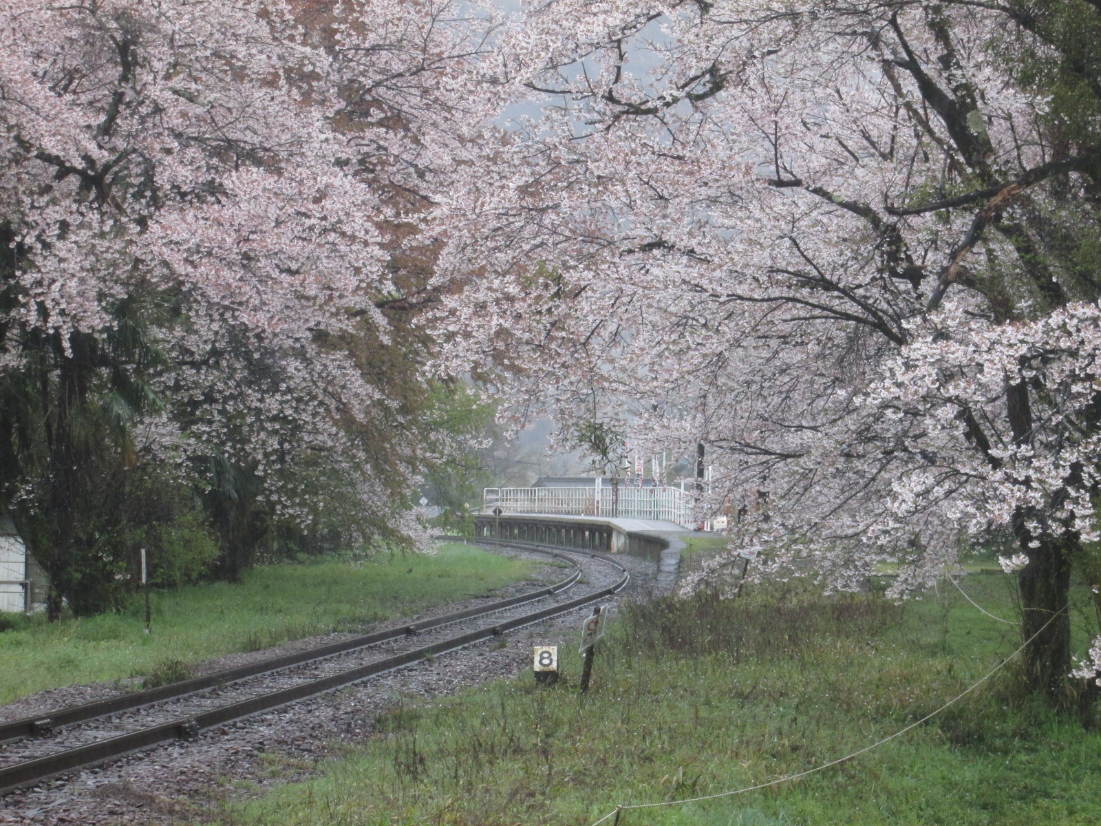 桜に包まれた無人駅。春雨にうっすらと色づく桜に、春の旅情を感じさてくれました。静かな山間にあるので、ゆっくりと春を満喫できます。
