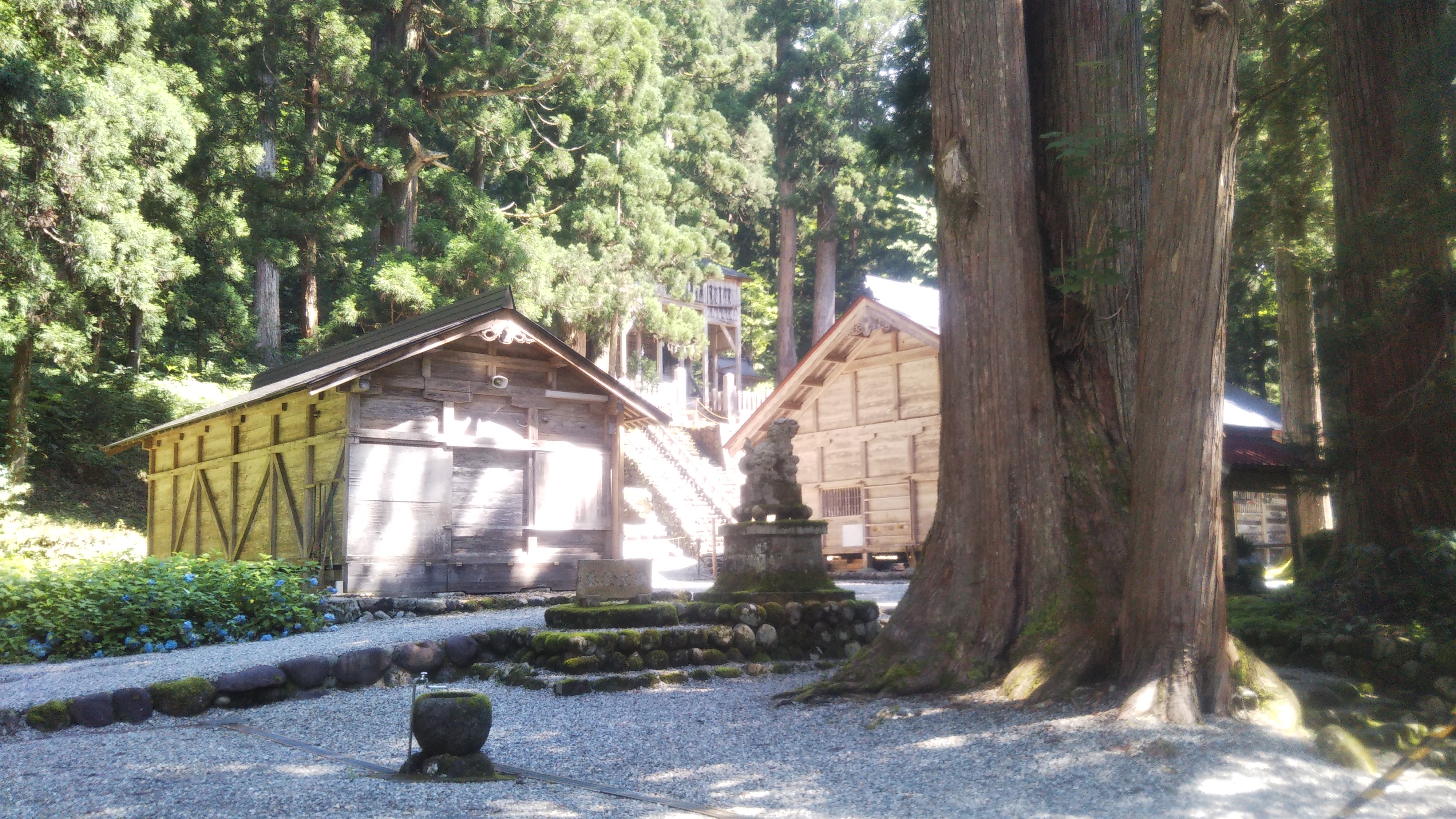 白山の麓の村(石徹白)にある、大きな神社。大きな杉の木が、たくさん立っているのが、印象的でした。3月下旬に行ったのですが、境内には雪が残っていました。(道路は大丈夫)山の麓にあり、神社らしい神社って感じです。神社の駐車場には、結構多くの車が駐車されていました。境内は空いていたので、おそらく、釣りか登山だと思います。