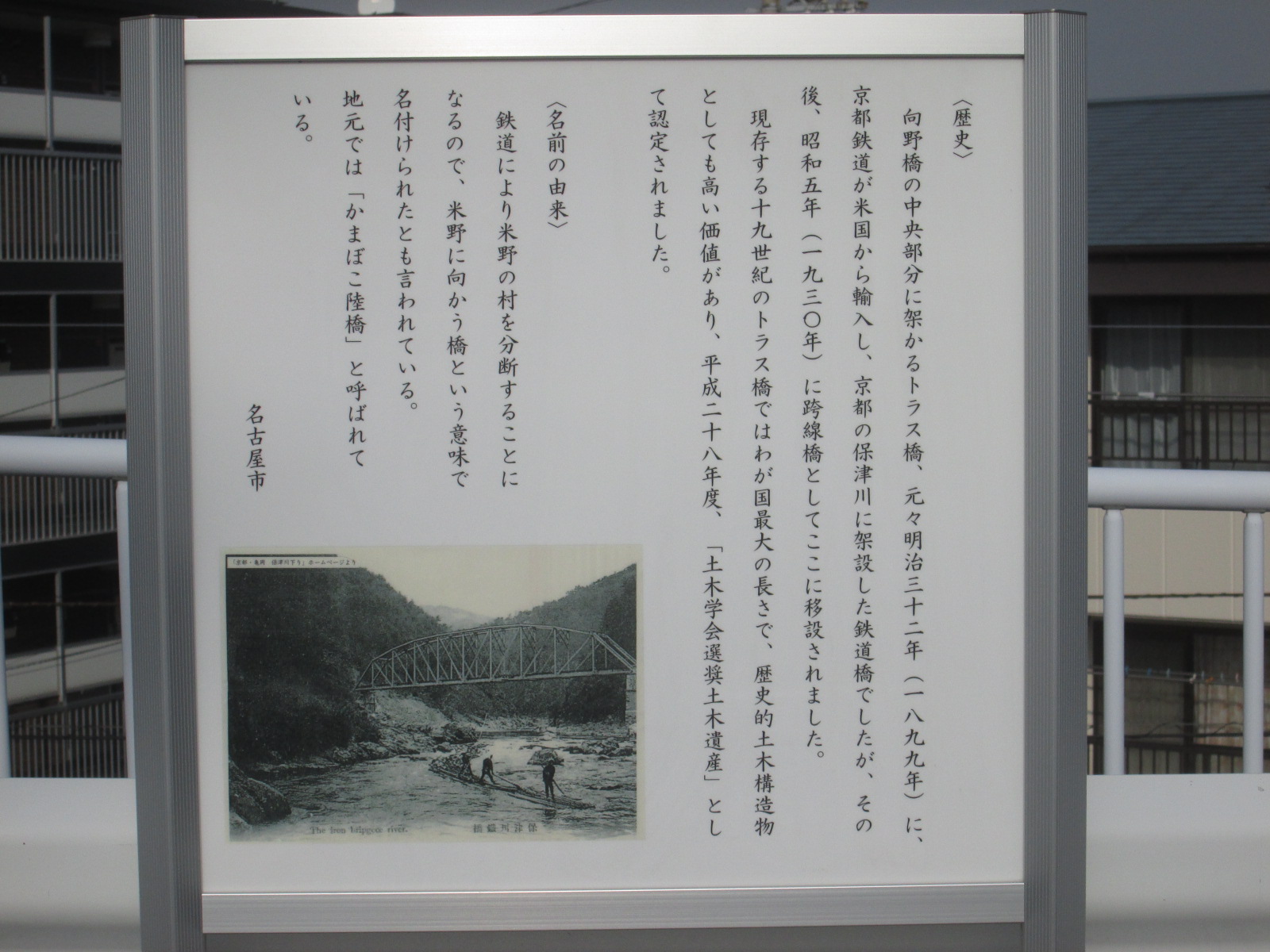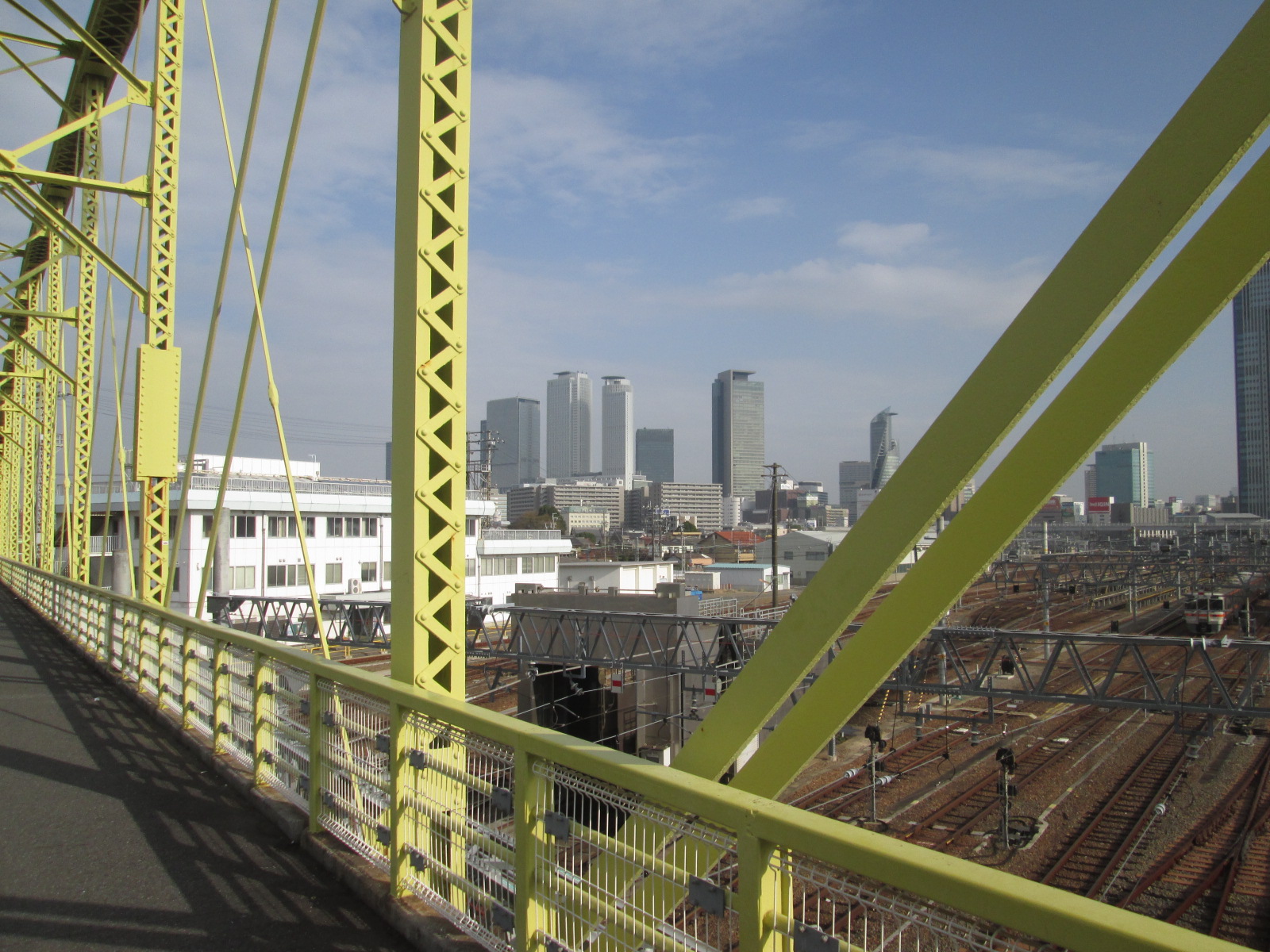 歴史的鋼橋として土木学会から推奨された土木遺産になってうる“跨線橋”です。もともと1899年(明治32年)に京都鉄道の保津川橋梁として掛けられていた鉄道橋で、1930年(昭和5年)に源氏に地に移築されたとか。橋の下はJRの車両区などがあり、車両のメンテナンスなどがされていました。橋からは名古屋駅の高層ビル群が一望できます。夜はいい感じで夜景が見れるかもしれません。