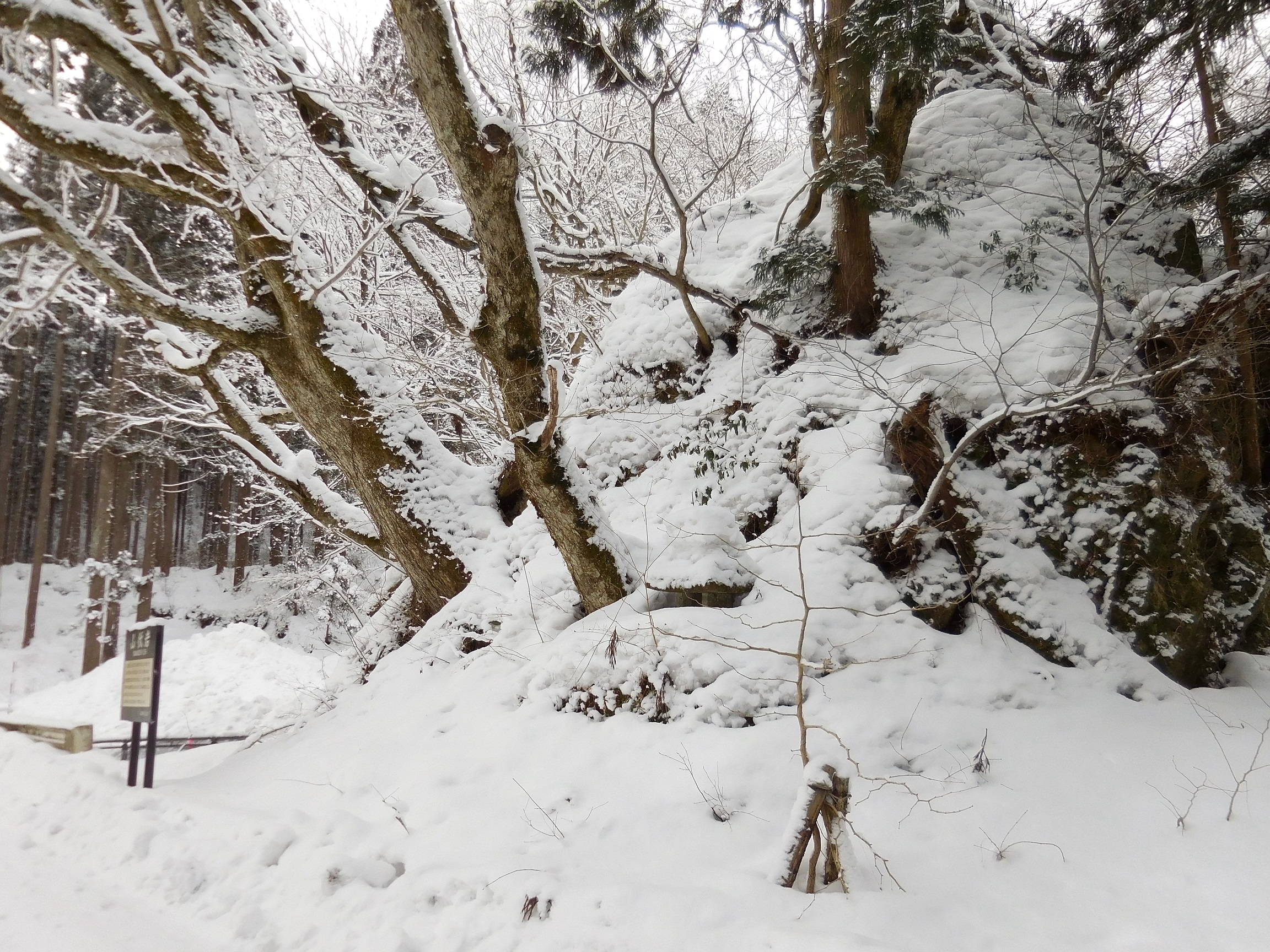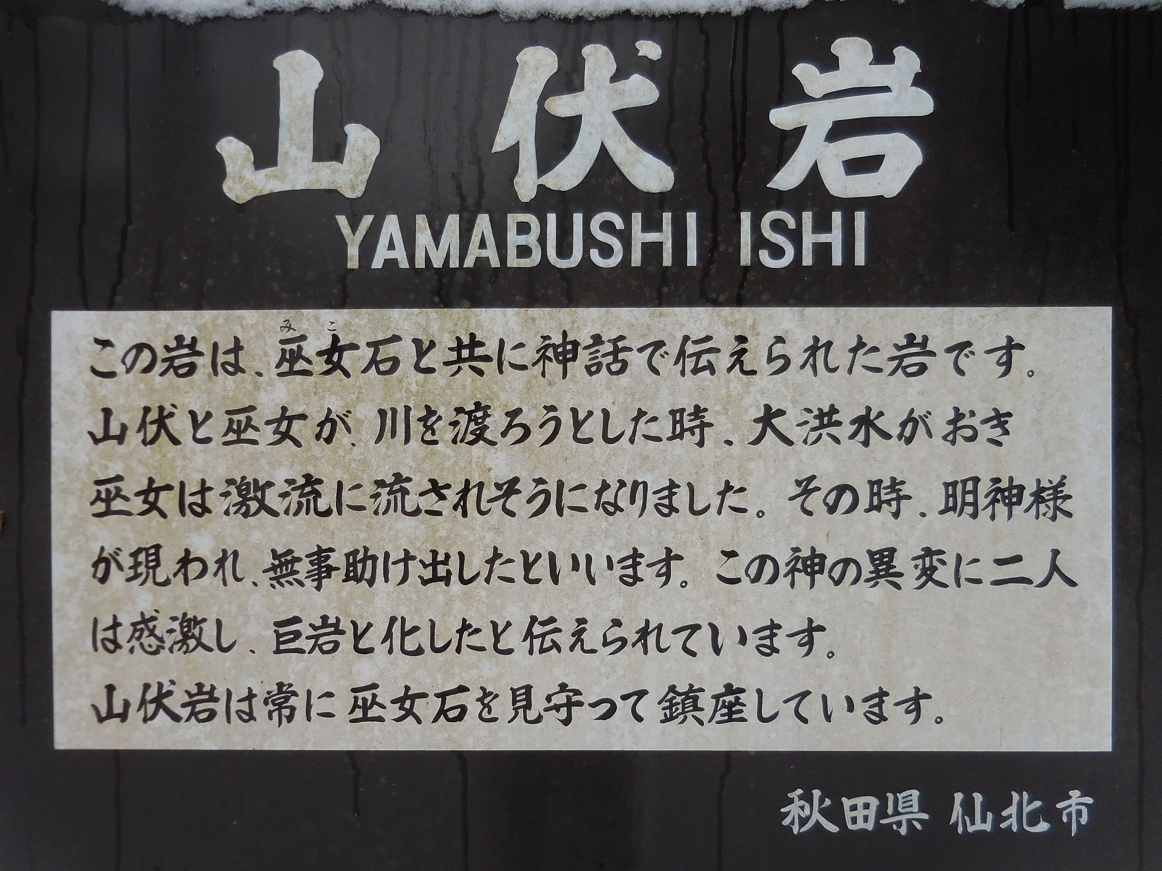 巫女石と対になる存在の岩です。すぐ脇には山伏岩暗渠があり、そこには田沢疎水が流れていて、多くの田畑を今も潤しています。