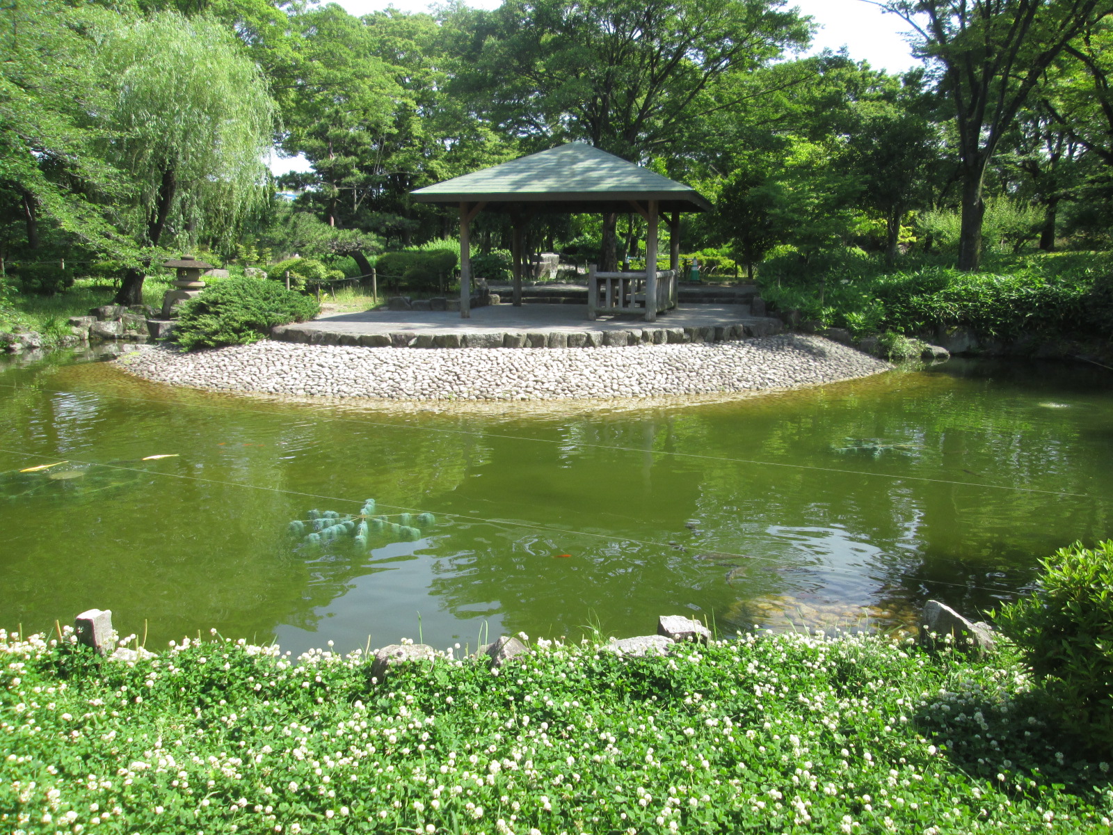 川沿いにある公園で、園内には緑があふれていました。遊歩道が整備されているので、散策しながら緑に触れ合えます。ラベンダー園・日本庭園・サンクガーデン・多目的広場・・・などがありました。