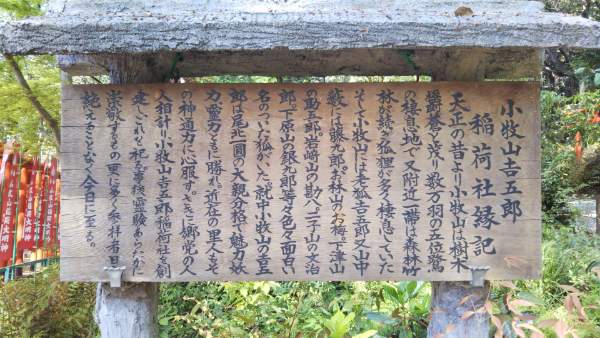 小牧山にある稲荷神社です。由緒書きによると、老狐「吉五郎」という狐の伝説が伝わる稲荷神社とのこと。清掃されている方もいたので、今でも大切に守られている稲荷神社とう感じです。山の木々に包まれているので、静かな雰囲気を漂わせていました。