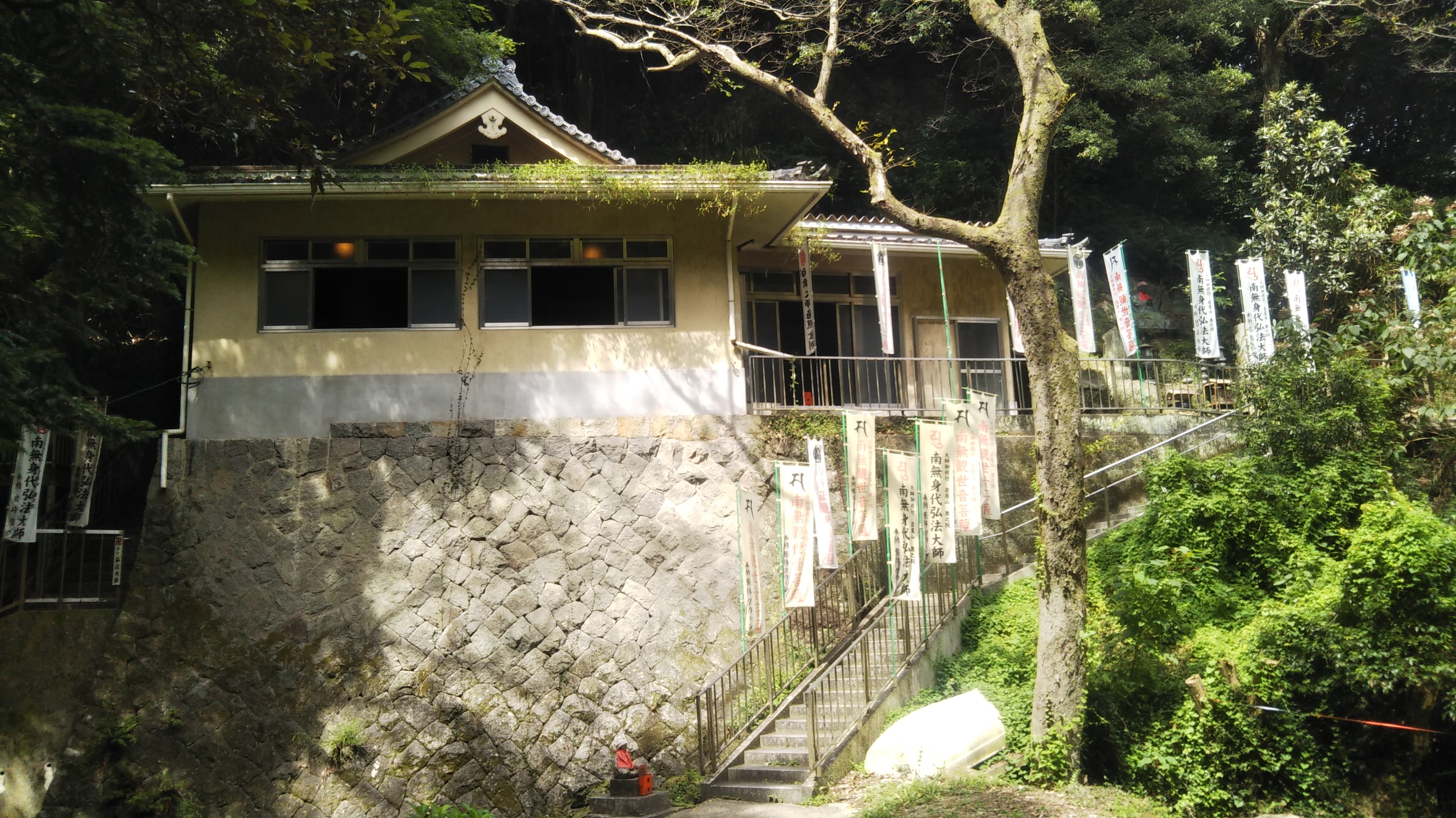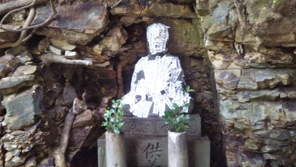 山の岩肌に寄り添うような場所にあるので、とても静かで神聖な雰囲気に包まれていました。本堂の周りには、朱色の三重の塔・観音堂・池などがありました。本堂の脇には、お札の張られた石像が鎮座。たぶん身代弘法大師ではないかと思われます。