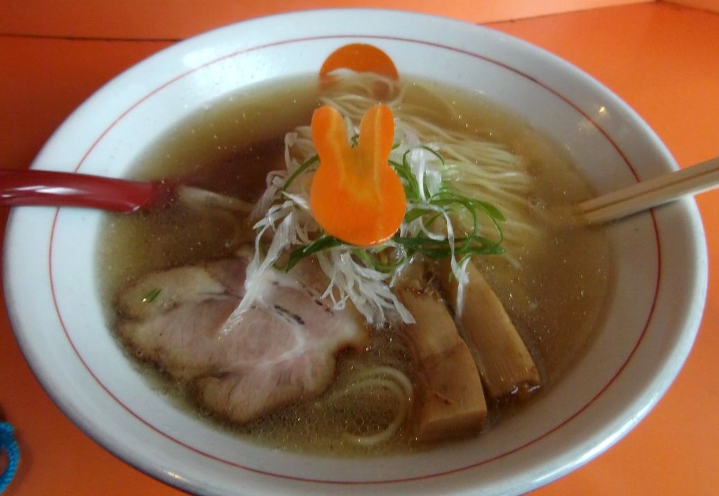 今回は、中華そば」を頂きました。透明あっさりスープに細ストレート麺、ウサギ型のニンジン・チャーシュー・刻みネギ・メンマの具材、優しく・爽やかな味付けです。