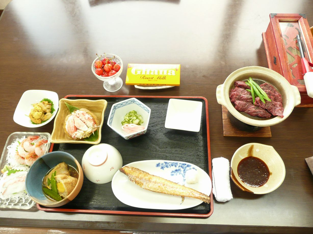 宿泊料金は安価なのですが、ある日の夕食のメニューには、毛がに(400~500gサイズ)剥き身・北ムラサキウニ剥き身(3~4個分)が付いていました。これだけでも高価ですが、加えて甘エビとタコの刺身・八角の焼魚・牛肉の陶板焼き・卵巾着煮・イカとキュウリの酢の物・岩海苔の味噌汁・デザート(サクランボ・チョコレート)なども付く豪華絢爛の食事でした。