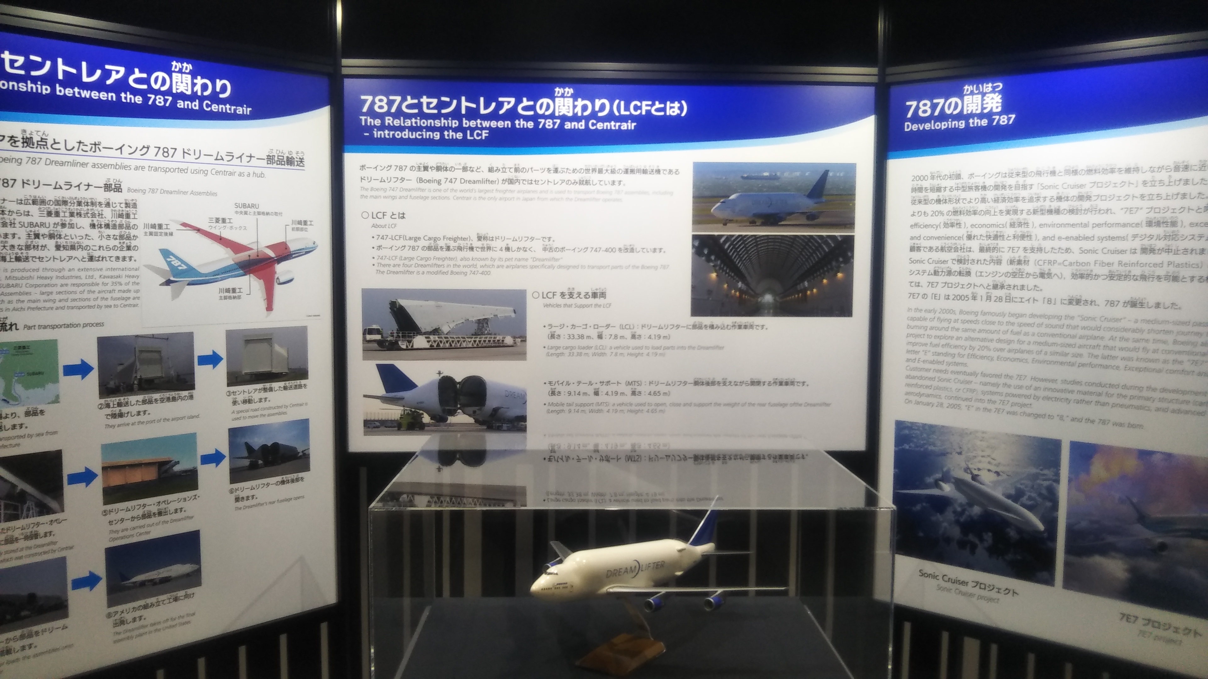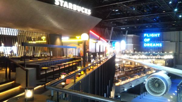 ボーイング787初号機が展示してあるテーマパークです。セイアトルテラスという飲食店フロアから787全体を鑑賞することができます。特に「スターバックス」店は、787真正面に位置しているので、特等席という感じです。コーヒーを飲みながら映像と音のショーを見ていると、夢の世界にいるようでした。