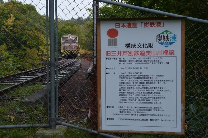 この橋梁は、芦別で操業していた「三井鉱山」が石炭運搬専用線の延長のため、1945年(昭和20)に建設し、1989年(平成元年)の廃線まで使用されていました。