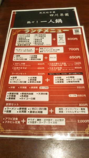 ランチ食べてきました。エビチリ定食・レディース定食・ラーメンセットなどいろんなメニューがあります。値段も1000円以下ですので、財布にも優しいです。今回は「四川麺&中華飯」をいただきました。真っ赤な四川麺のピリピリ感が病みつきになりそうでしたよ。