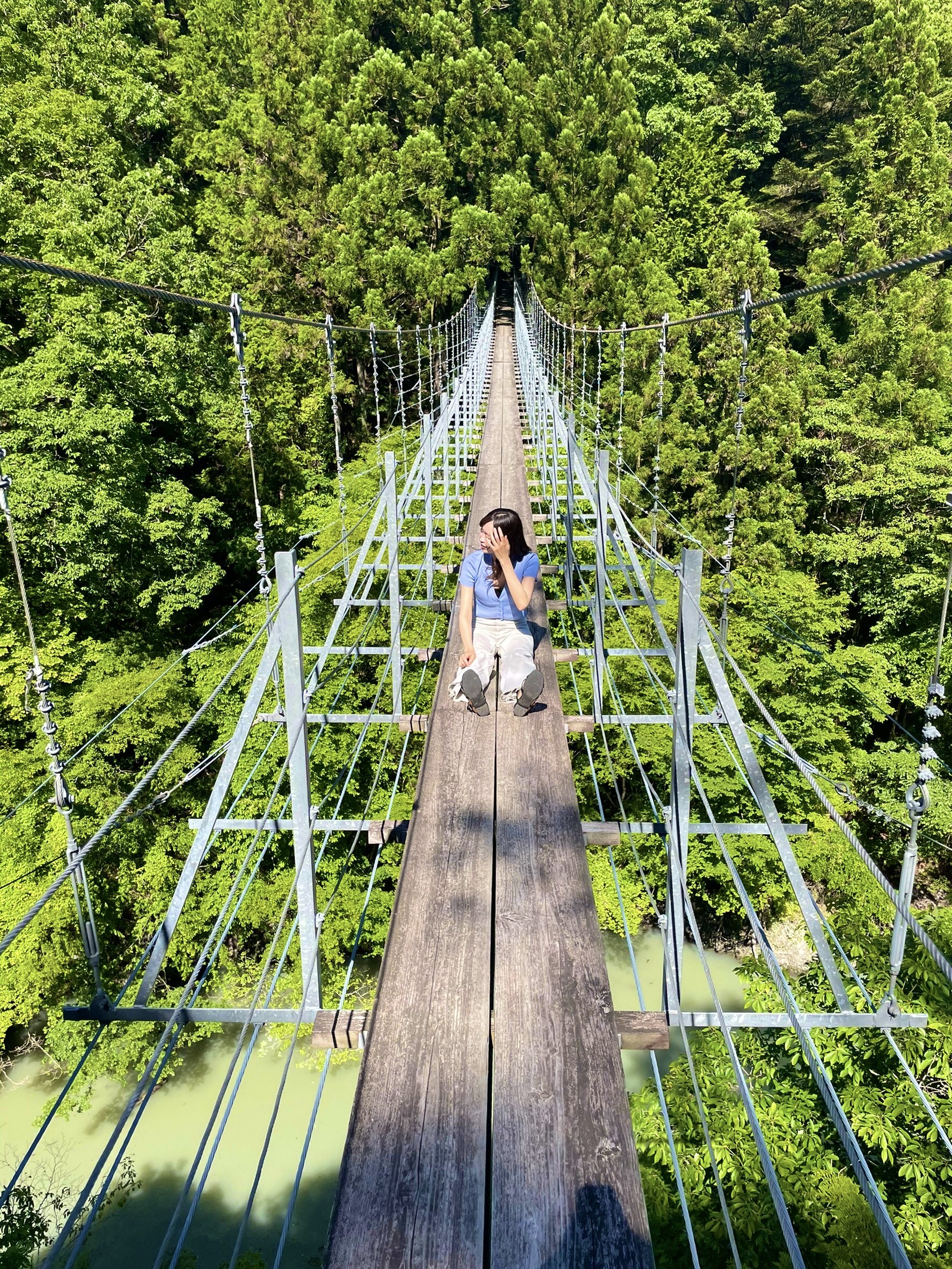 静岡には同じような場所に有名な吊り橋があり、それも夢の吊橋という名前です。私も当初はそちらに行く予定でした。Googleナビに従って進んでいくと、びっくり。写真と全く違う1ミリも観光開発されていない夢の吊橋に到着してしまいました。せっかくなのでとんでもなく急な道を降りていくと、広がっていたのは緑生い茂る綺麗な吊り橋でした。とんでもない景色に圧倒。その後行った有名な方の吊り橋が霞むほどの絶景でした。