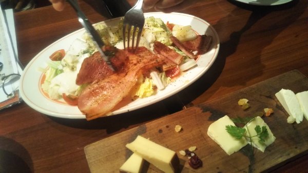 地下にある洋食のバールです。そら豆のフリッター、ポテサラ(withイカ墨)、ビーフカツ、豚のロース煮、ローストビーフなどいろんな洋食を頂けます。地下にあるのですが、オ-プンテラス風なので開放感あります。