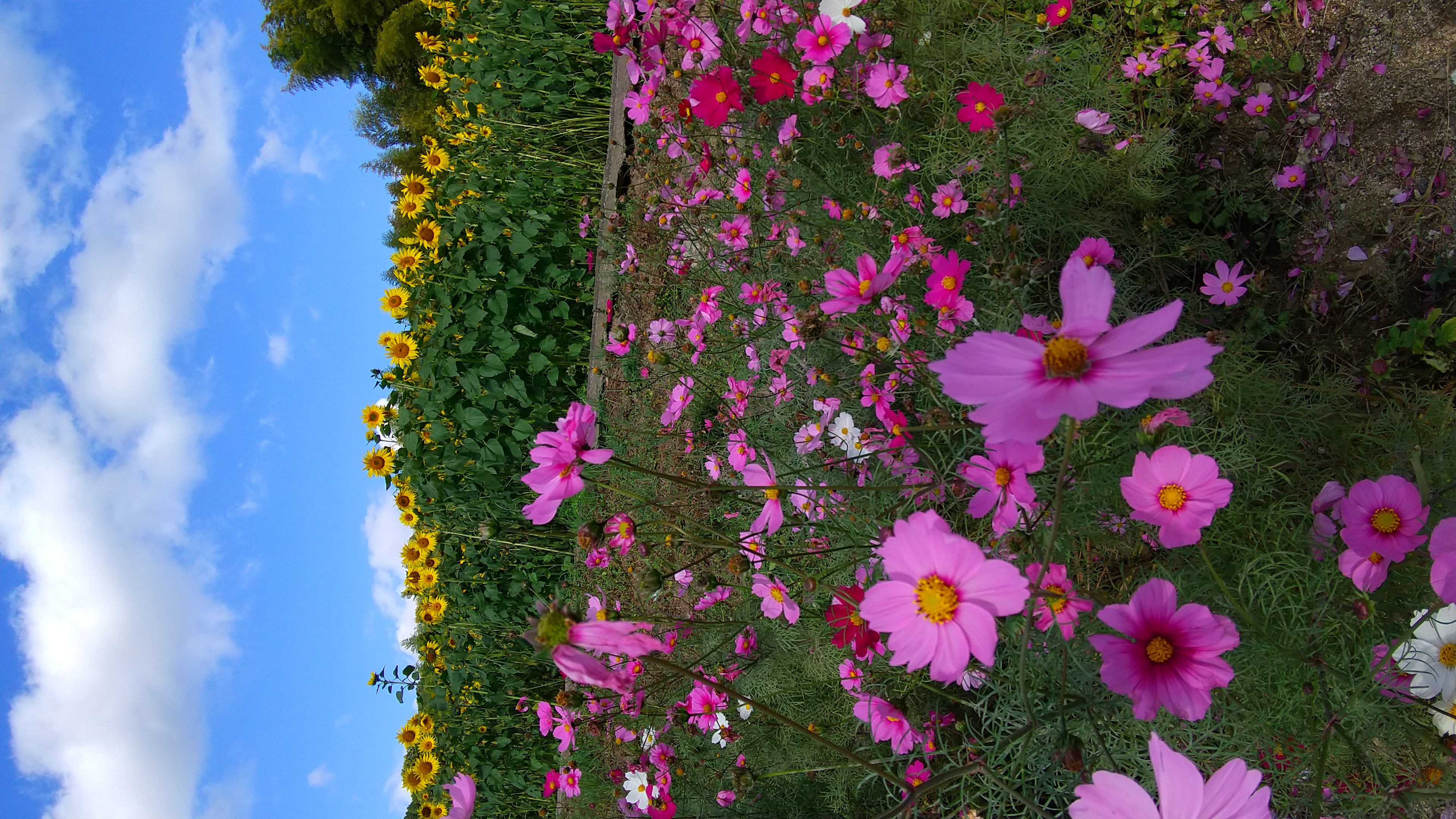 秋に満開のひまわりを見られます。コスモスと一緒に咲いており、色鮮やかな景色は見ものです。